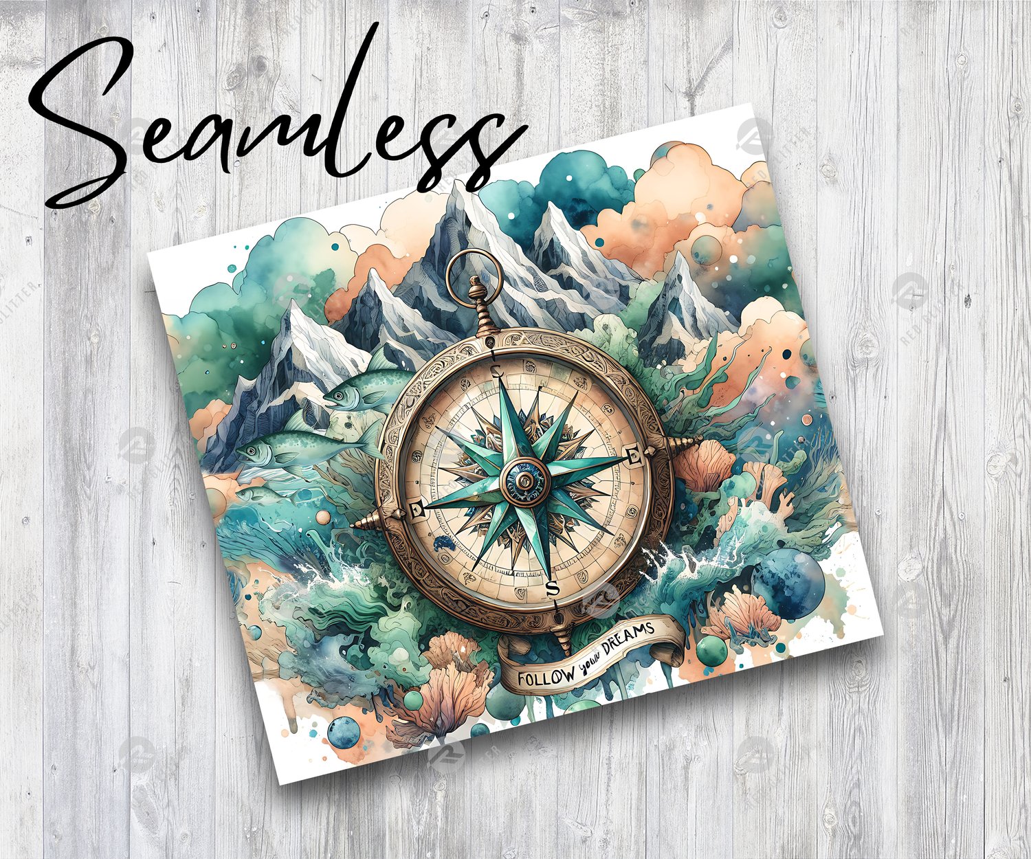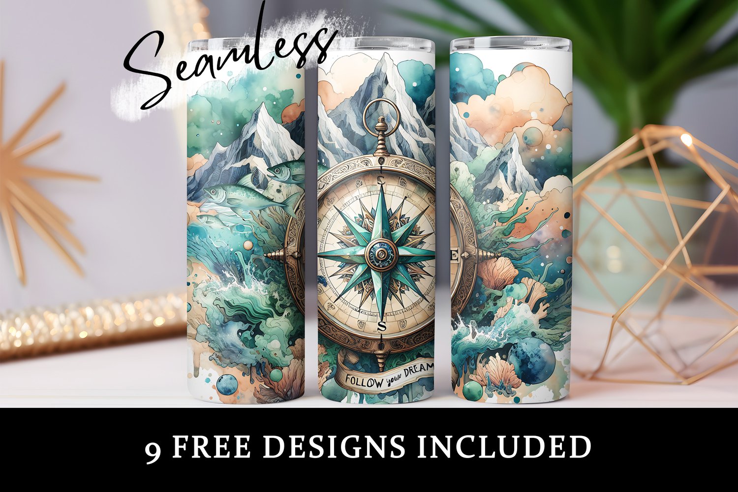 Compass with Mountains Range Tumbler Wrap, Adventure Follow Your Dreams 20oz Sublimation Tumbler Design, Travel Nautical Wanderlust Instant Download PNG