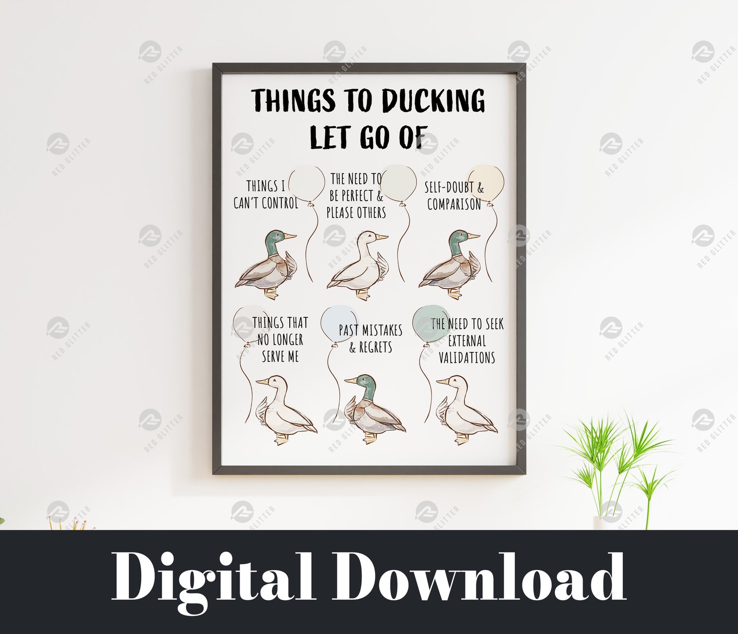 Lighten your mental load with this funny and whimsical "Things to Ducking Let Go Of" printable art! Featuring six charming hand-drawn ducks and neutral color balloons, this poster serves as a gentle visual reminder to release what no longer serves you. Perfect for a therapist’s office, counseling room, or a calming corner at home, this print combines professional mental health concepts with a playful, approachable aesthetic. It’s an ideal tool for anyone who wishes to visualize letting go of anxiety and stress.